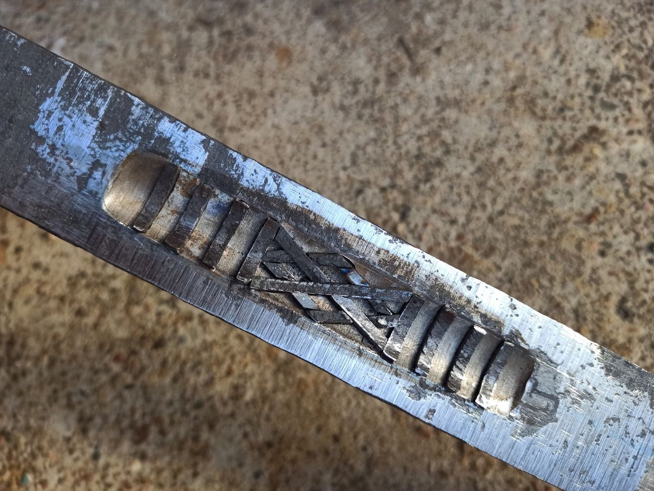 Parte 1. Experimentos con inscripciones de acero damasquinado en la acanaladura de la hoja.