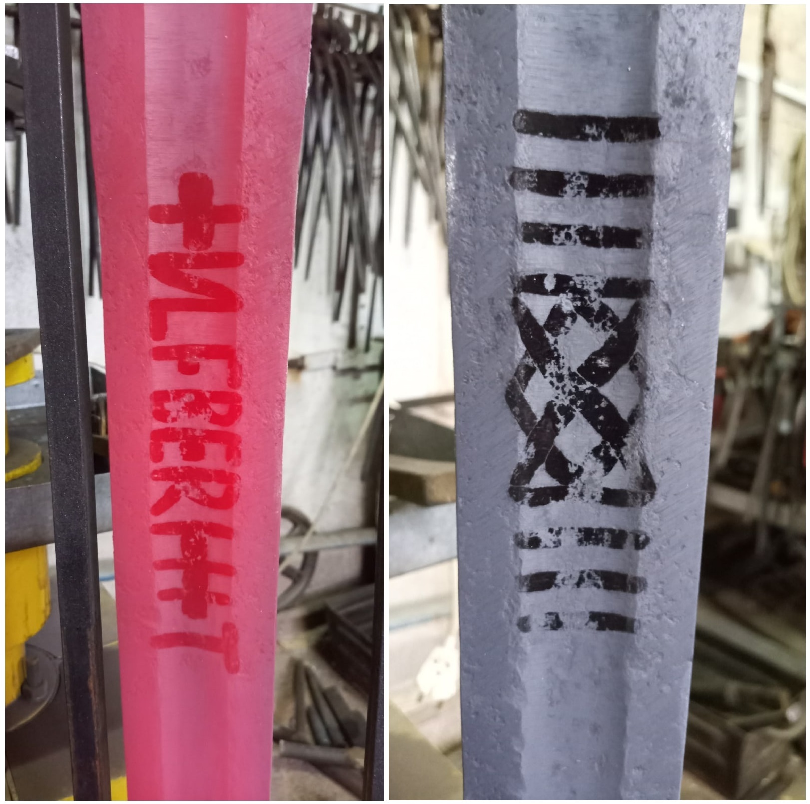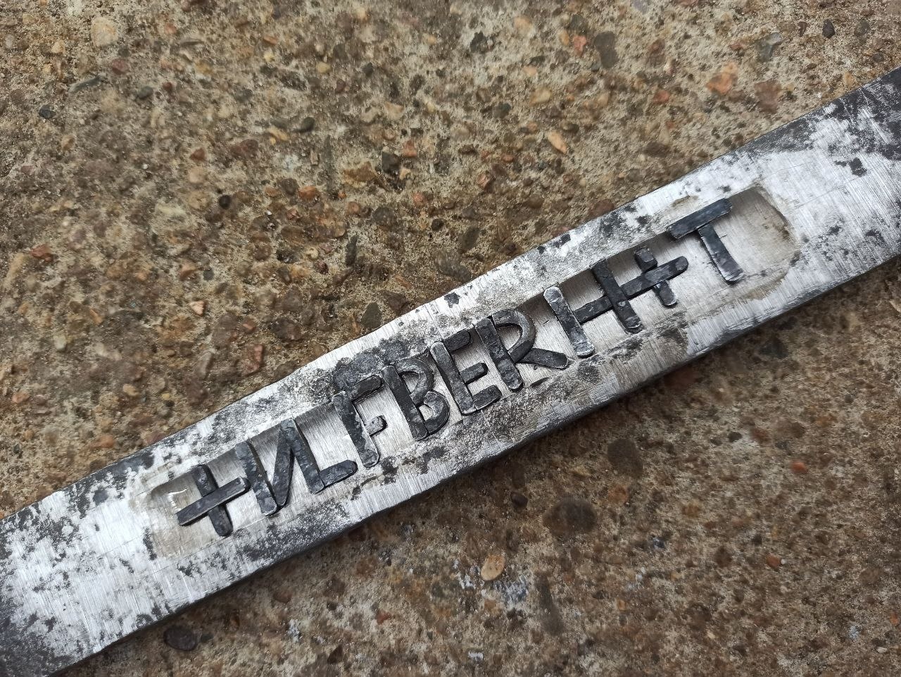 Una placa de acero de prueba para entender hasta qué punto se deforma la tipografía durante la forja, qué profundidad y calidad de soldadura consigue el damasco, cómo soporta todo ello el tratamiento térmico, qué márgenes dejar para el desbaste, etc.